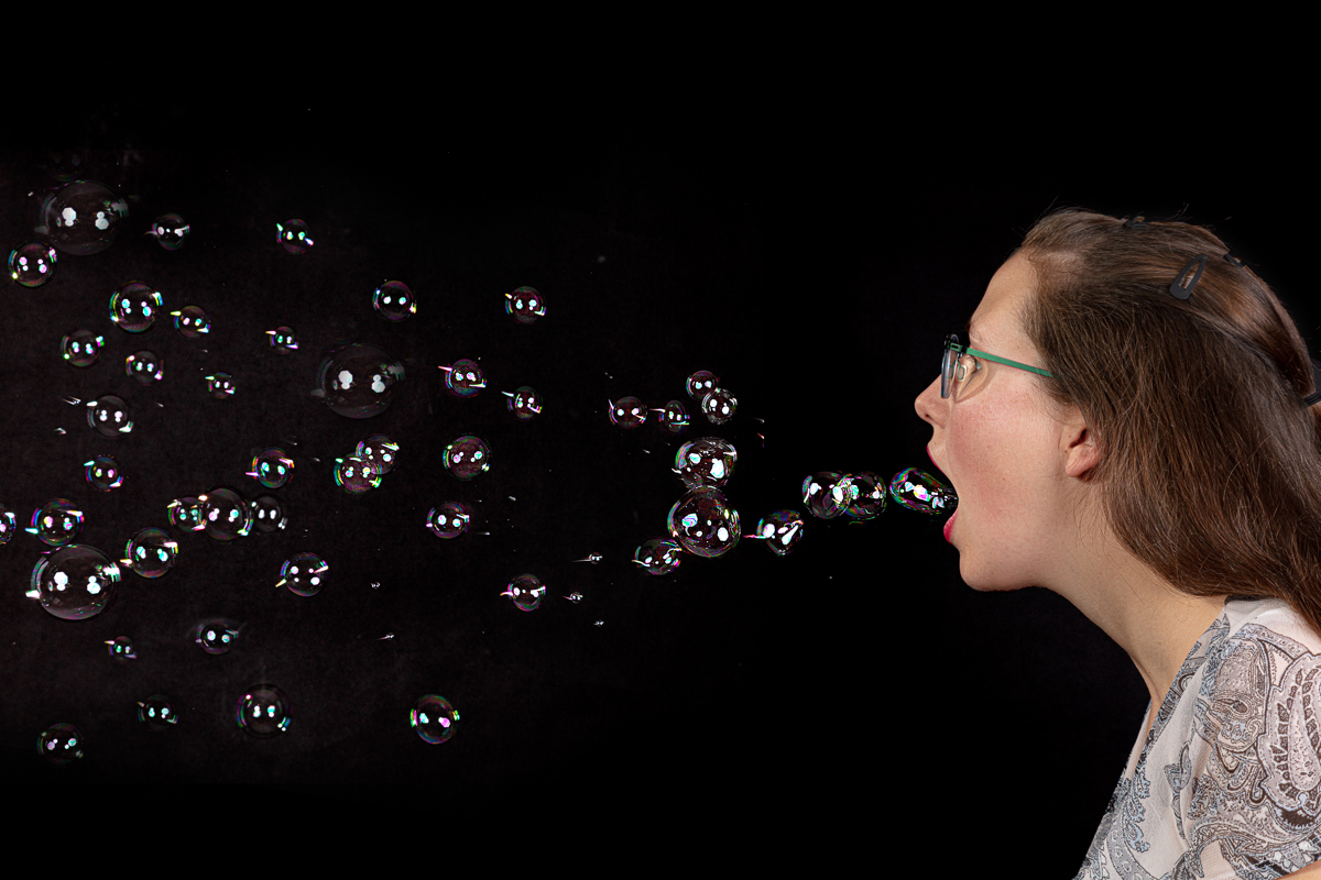 Model(-Drache) speit Seifenblasen...